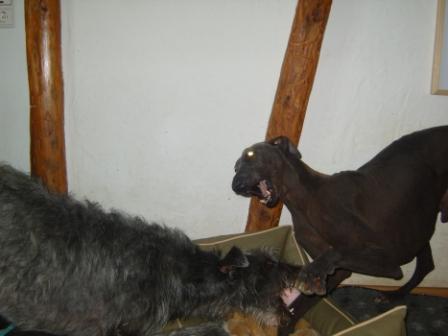 Das Beste aber ist, wenn Rudi, unser alter Afghane, kommt. Leo hat als Einziger keine Angst vor Rudi und klaut dem Alten manchmal ein Leckerli. Wenn Rudi dann kommt und furchterregend bellt und kurz vor dem (Über-)Schnappen ist, dann klemmt Leo nur die Augen zu und frißt weiter. So ganz nach dem Motto: Ich seh dich nicht und du siehst mich dann auch nicht!