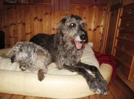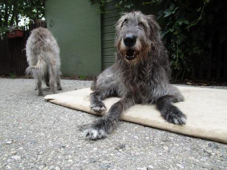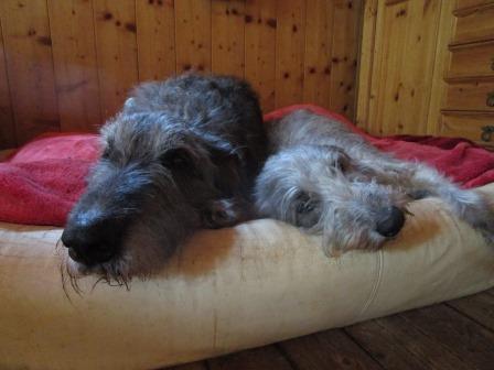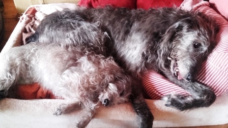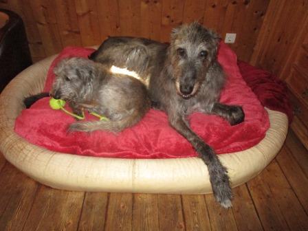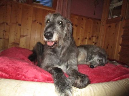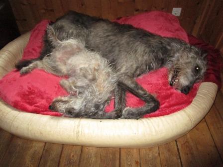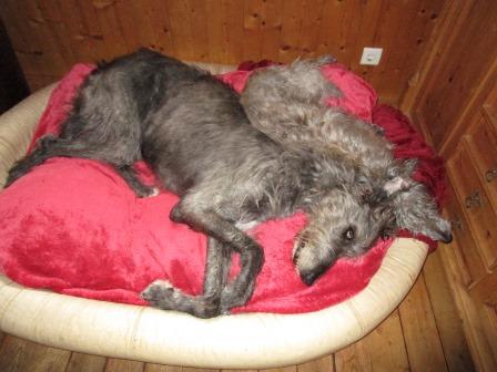 Jogi hat nachts seine Caoimhe gesucht, als wir ohne sie nach Hause kamen. Er hat sich dann ins Bett geschnuckelt und meine Hand geleckt, bis er eingeschlafen war. Am nächsten Tag hat er gefressen und sich danach in einem Körbchen gewälzt. Es geht ihm gut, was mich sehr freut. Er wird sein Leben hier genießen bis zu seinem letzten Atemzug.