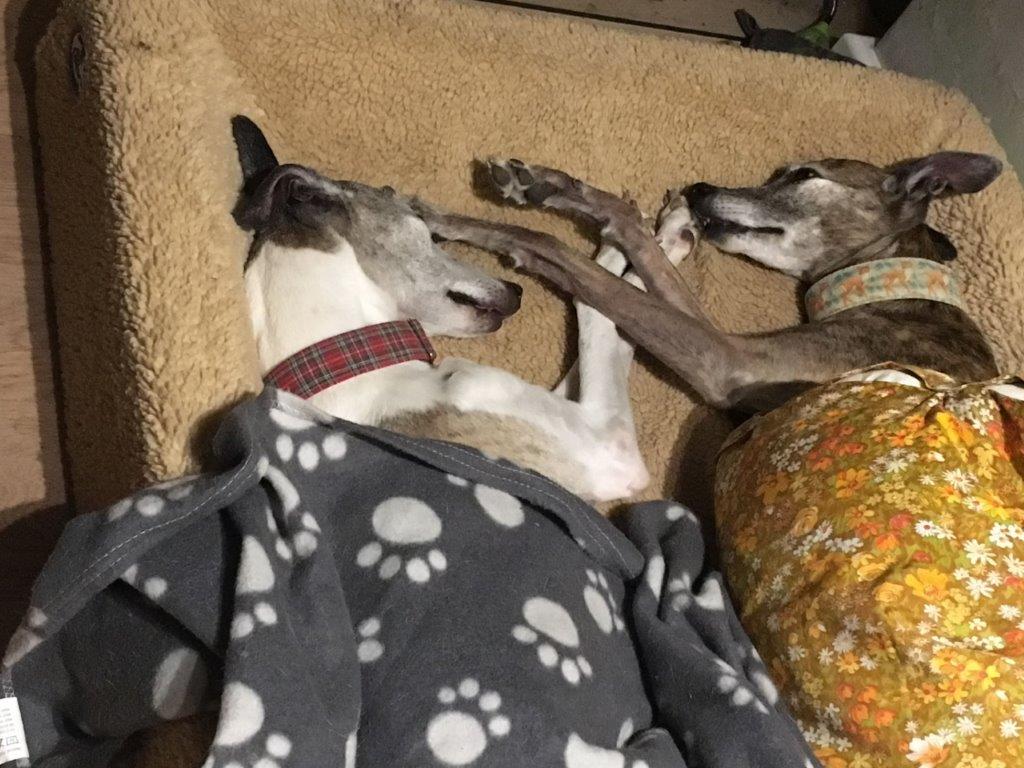 Whippethündin Sam trauert um ihren Freund, sie stand ihm bis zum Ende bei und legte sich immer wieder zu ihm.