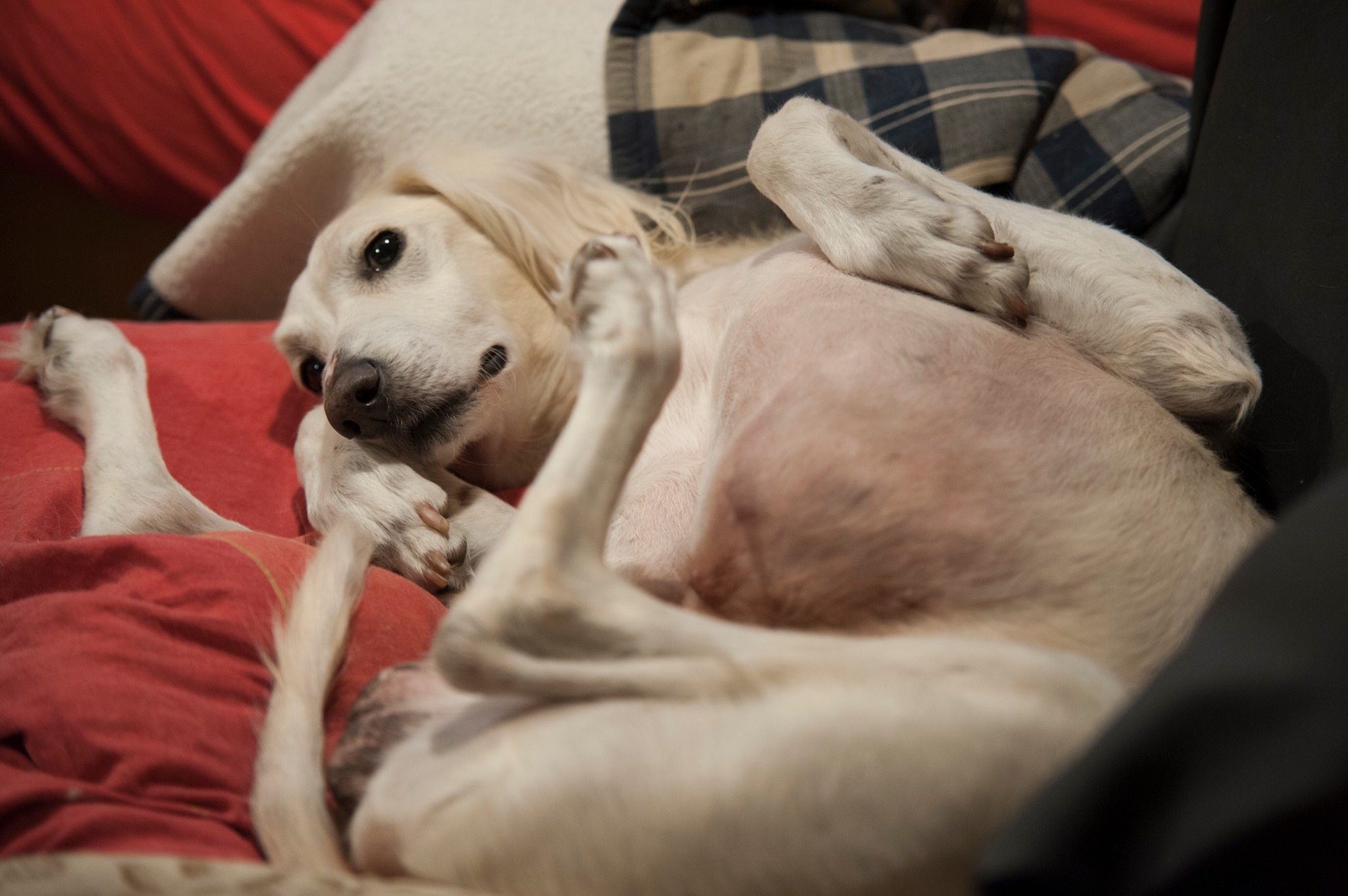 „Die Haut wechselt an Bauch und Bug langsam von gräulich-schwarz-rot-scheckig-schrundig auf rosarot, Fell wird schöner. Er sieht ganz allmählich immer weniger aus wie ein alter Golden Retriever und mehr wie ein gestandener Saluki. Einziger Wehrmutstropfen: Ein Hoden ist komisch, muss ab.“