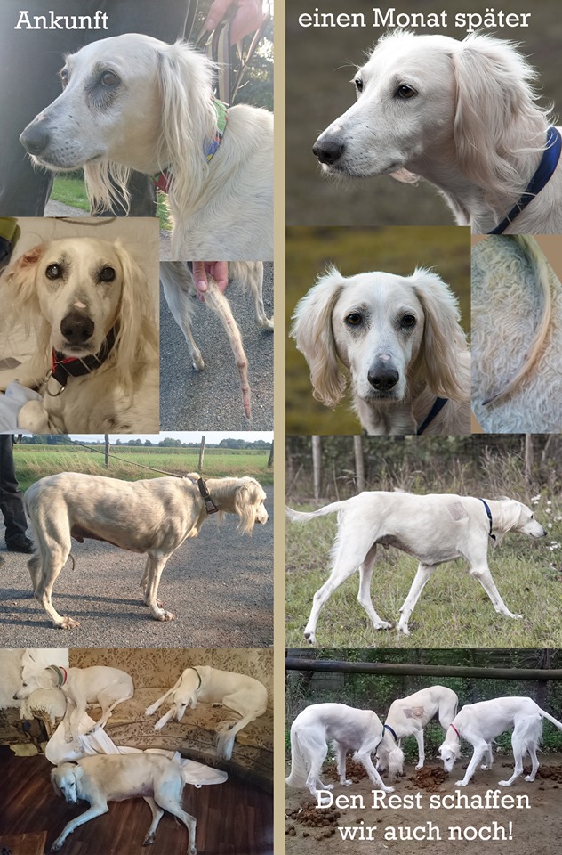 Mir gefällt, daß bei der Windhundhilfe in der Regel die Hunde erst gezeigt und vermittelt werden, wenn sie wieder ihre Würde zurückbekommen haben. Damit Interessenten sich dann wirklich in den Hund verlieben und nicht nur aus Mitleid anrufen. Trotzdem denke ich ist hier mal ein Foto angebracht mit dem Vergleich Chabuk bei der Ankunft und nach gut einem Monat.