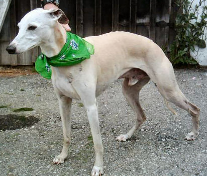 Whippetrüde, schon älter, hellsandfarben mit weißem Fleck im Nacken und ziemlich vielen Narben, gefunden am 26.08.05 um 10.30 Uhr am Ortsende von Kreßbronn nach Nonnenhorn am Bodensee.