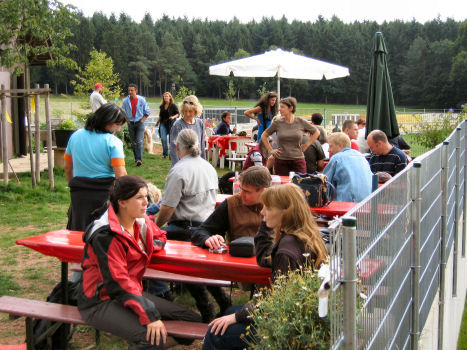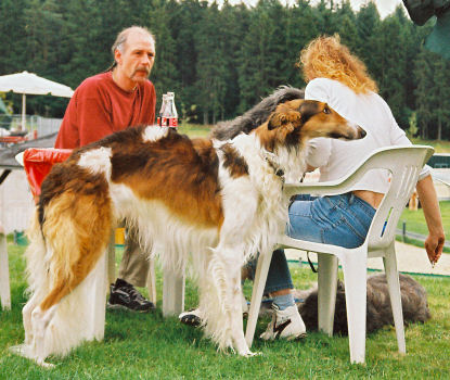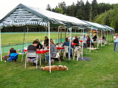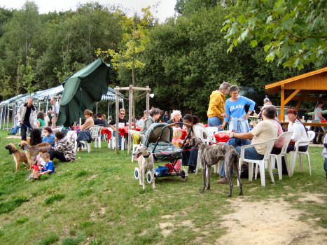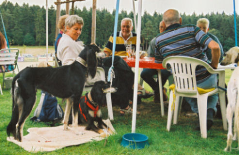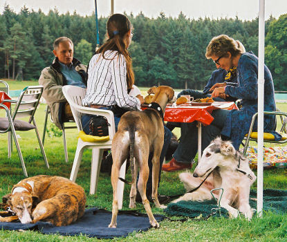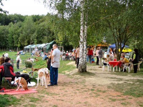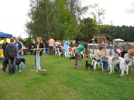 Insgesamt waren über 220 Menschen und mindestens doppelt so viele Hunde anwesend, trotzdem verlief der Tag sehr harmonisch und friedlich. Unsere Küchenmeister hatten wieder herrliche Leckereien aufgetischt, die Hunde durften auf der Bahn laufen, sich danach im Innenkreis vergnügen und ihre Menschen kamen sich bei intensiven Hundegesprächen näher. Das Wetter hielt und wir waren sehr glücklich, viele ex-Schützlinge mit ihren lieben Menschen wiederzusehen. Besonders beeindruckend war der Auftritt von zwei Irish-Wolfhound-Besitzern, die zusammen mit sechs Wölfen (inkl. Tara und Connor)anmarschiert kamen und eine sehr lustige Truppe bildeten.