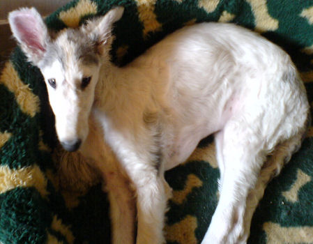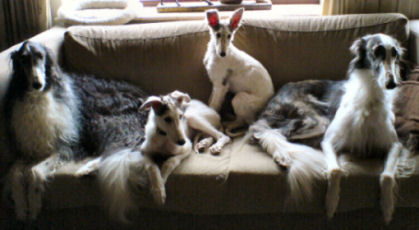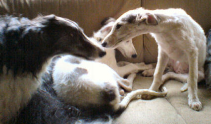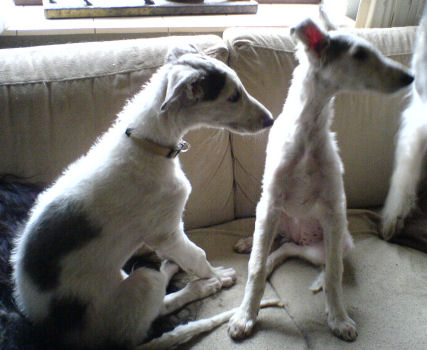 Familientreffen zwei unserer damals 6 Wochen alten Barsoiwelpen. Wie man sieht haben sie sich schon prächtig entwickelt.