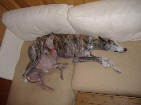 Hier sehen Sie Whippet Mandy beim Sonntagnachmittagsschläfchen mit ihrem großen Freund.