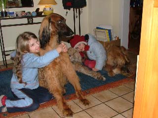 Beide hatten vom ersten Moment an keinerlei Probleme mit unseren Töchtern, alle sind ein Herz und eine Seele und wir können wirklich behaupten, dass alle mit sicherem Gefühl als klar definiertes Rudel zusammen leben. Somit hat sich wieder bewiesen wie sozial sicher Afghanen sind, selbst wenn sie Schicksale hinter sich haben.