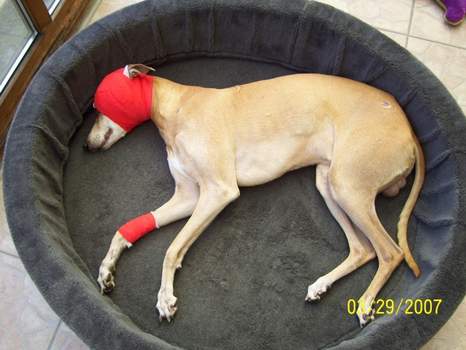 Das Foto ist auch von gestern, denn heute ist der Verband schon ab und Muckl sieht heute wirklich noch so schlimm aus, dass wir hier lieber kein Foto einstellen.