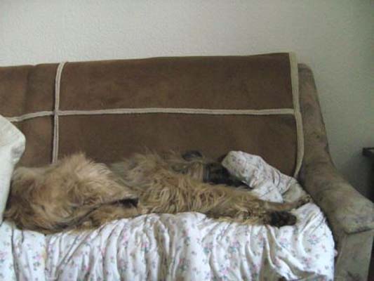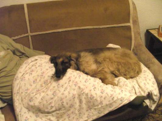 Heute Morgen ca. um 7 Uhr ist Victor als einziger mit mir in den Garten zum Pieseln gegangen. Die anderen waren noch zu müde! Victor hat ausgiebig überall geschnüffelt, als er plötzlich die Katze von nebenan im Garten gesehen hat, oha, da wurde der alte Mann für seine Verhältnisse ganz schön schnell. Na ja, die Katze hat dann doch gewonnen. Er ist dann noch etwas herumgestromert, den Matschepaddock hat er auch schon gefunden, als er rein kam war er kein Fell sondern ein Heumonster ich weiß nicht wie er es gemacht hat, aber er war von oben bis unten mit Heu bedeckt, als ob er sich darin gebadet hätte. Im Moment liegt er in seinem Körbchen und ruht, war wohl alles ein bisschen zu viel, ich habe ihm ein weiches Federbett hineingelegt und mit meiner Bettdecke, die leicht ist, zugedeckt. Er geniesst es!!!
