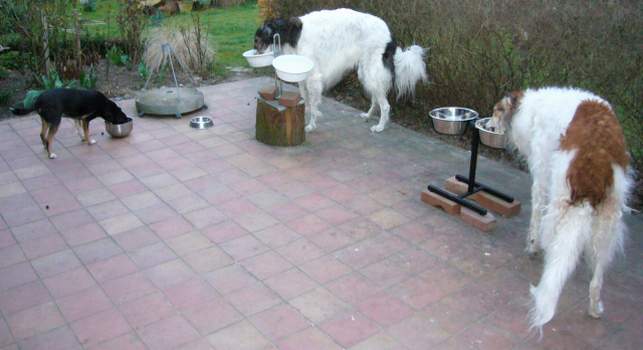 Auch von unserem alten Fedor (ganz rechts) gibt es ein Foto. Friedliches Miteinander mit den neuen Freunden beim Frühstück. Dort lebt Fedor mit einem ebenfalls 10 Jahre alten Barsoi und einer Mixhündin. Über die Vermittlung von solch alten Schätzen freuen wir uns ja immer ganz besonders.