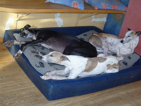 Bereits am Dienstag wurden unsere beiden Whippetbuben Zeus und Apollo abgeholt. Sie fühlen sich schon richtig Daheim in der neuen Umgebung, lümmeln auf dem Sofa, rasen mit ihrem neuen Whippetkollegen um die Wette, ärgern die beiden Jack-Russells, jagen die Katzen und halten ehrfürchtig Abstand von den Pferden. Nachts wird natürlich im Bett von Herrchen und Frauchen Wärmflasche gespielt.