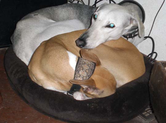 Obwohl ja häufig behauptet wird Sloughi und Whippet würden nicht zusammenpassen. Unsere Sloughi-Hündin Hafida und Whippet-Hündin Elli liefern den Gegenbeweis. Sie passen sogar zusammen in ein Whippetkörbchen...