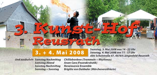Am 03. und 04. Mai 2008 (Sa. 14.00 – 22.00 Uhr, So. 11.00 - 17.00 Uhr) findet der 3. Reusrather Kunsthof statt und öffnet für Besucher Atelier, Hof und Garten.