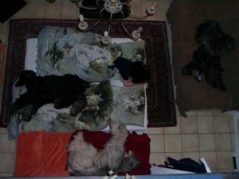Auf einem kann man auch gut sehen, wie das Problem "zu kleines Schlafzimmer für drei große Hunde" gelöst werden kann. "Mann" muß eben jeden abend eine ordentliche Schlafstelle im Wohnzimmer errichten.