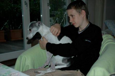 Gestern ist Möpsi umgezogen. Die kleine Whippetmaus hat sich sofort auf dem Schoß von Joshua (Sohnemann der neuen Besitzerin) niedergelassen und ausgiebig geschnarcht - wenn das kein gutes Omen ist. Alle sind begeistert von der Kleinen, die heute Nacht schon fest ans neue Mami gekuschelt unter der Bettdecke verbracht hat.