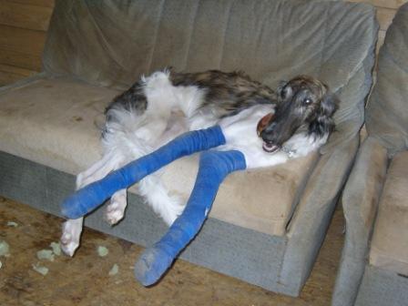 Gestern war sein großer OP-Tag. Beide Ellenbogengelenke wurden operiert, der lose Gelenk-Knorpel entfernt, die Beine sind von unten bis oben verbunden und wir sollen Dymas mindestens 10 Tage lang sehr schonen, d.h. nur angeleint in den Garten, wenn möglich in ein Zimmer sperren, weg vom Rudel, damit keiner mit ihm tobt und spielt. Ganz schön sch... schwer, für ihn und für uns, denn wir hassen es, einen Hund wegsperren zu müssen!