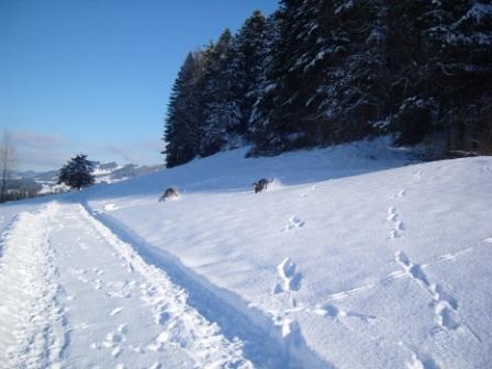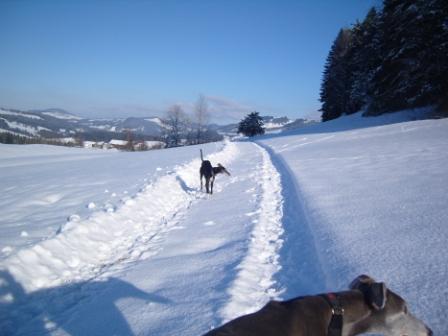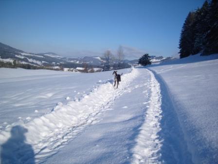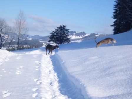 ...rennt er mit seinem Kumpel durch den Schnee...