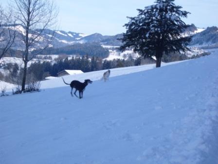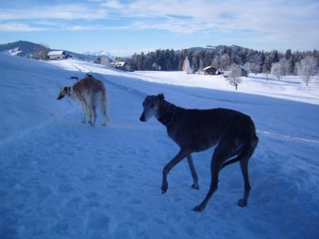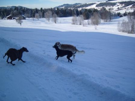 Ein paar Bilder vom Morgenspaziergang mit Cao, Hamlet, Eva und Leo. Cao hat in Hamlet einen ebenbürtigen Renner gefunden, sie rasen nebeneinander her und spielen, ohne Zwicken und Bellen - einfach toll!