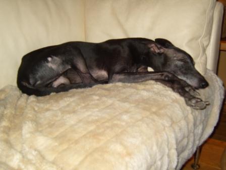 Arnie hatte inzwischen zwei Anfälle und wir haben einen Blutspiegel beim TA gemacht. Nun bekommt Arnie tägl. zweimal eine viertel Tablette Luminal. Bisher hat er keinen Anfall mehr gehabt, wir hoffen, das bleibt so. Arnie hat schön zugenommen und spielt am liebsten mit einem Quietschi-Bällchen. Als seine Pflegestelle ein paar Tage einen "fremden" Grey beherbergte, zeigte Arnie echte Hausmeisterqualitäten. Er verfolgte den Grey bis zu seinem Platz, wartete, bis dieser sich hinlegte, rannte dann zurück zu Frauchen um kurz darauf nochmal einen "Kontrollblick" auf den Grey zu werfen, ob sich dieser auch wirklich brav zum Schlafen hingelegt hatte oder ob er etwa wieder aufstehen wollte. Der Grey ist weg und Arnie so ein liebes Schätzchen wie zuvor. Besonders mit Whippets versteht sich Arnie prächtig, deswegen hätten wir am Liebsten ein Whippie-Plätzchen für ihn. Beim Spaziergang frißt er jede Menge Schnee und hüpft ausgelassen durch die Gegend. Wir haben das Gefühl, dass unser Arnie ziemlich viel nachzuholen hat. Bettschlafplatz fürs Leben gesucht!