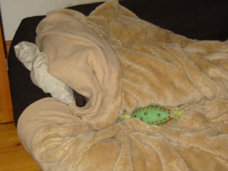 Irgendwann wurde Arnie vom Sohn der Pflegemama entdeckt, selig schlafend unter einem Stapel Decken.