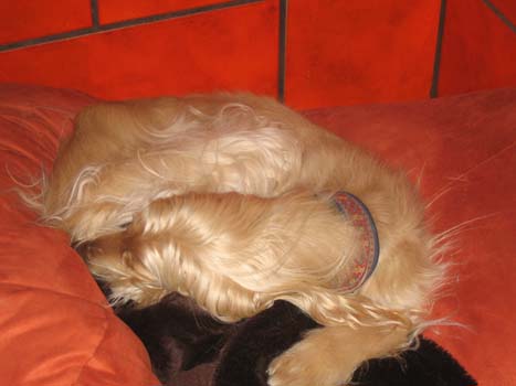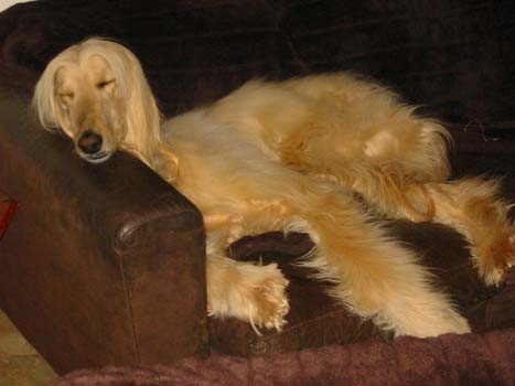 Und nachdem die Süße sich als ziemlicher Drachen entpuppt hatte und wir niemanden fanden, der sie als einziger Hund haben wollte (einem Zweithund konnte man sie wirklich nicht zumuten), entschlossen wir uns, sie als Grand Dame bei uns zu behalten. Da sie mit mehreren Afghanen bei uns lebte, fiel es nicht so sehr auf,daß sie z.T. äußerst übellaunig war. Alle wußten um Dully machte man einen großen Bogen, damit sie nicht zum Drachen wird. Alle unsere Afghanen haben das in kürzester Zeit gelernt und so hatte Dully recht friedliche Tage bei uns. Sie konnte jederzeit in unseren großen Garten zum Sonnen auf die Wiese, sich das beste Sofa aussuchen, Kuscheln etc..Auf dem Spaziergang lief sie immer frei und es war ihr herzlich egal, ob eine Auto in unserer Anwohnerstraße es eilig hatte oder nicht, sie trabte mittig auf der Straße bis sie im Grünen angekommen war. Wir machten dann immer etwas verzweifelt Handzeichen, i.S. "sie ist blind und taub" (war zwar gelogen)- dann war die Empörung und der der Zorn meist schnell verschwunden :).
