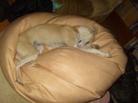 Ernie heute Abend total relaxed auf dem Sitzsack im "Exclusiv-Zimmer" des Sohns der Pflegemama. (in dieses Gemach hat nicht jeder Hund Zutritt)