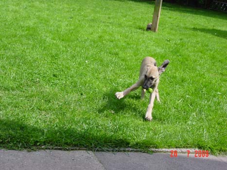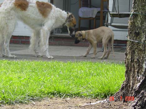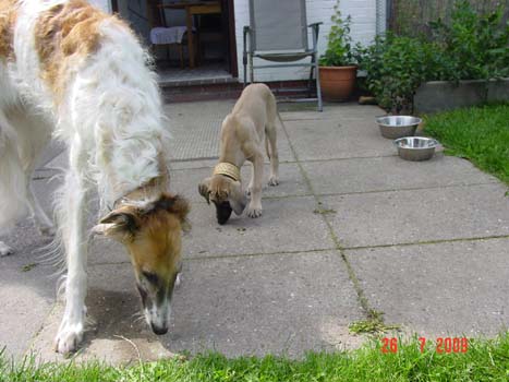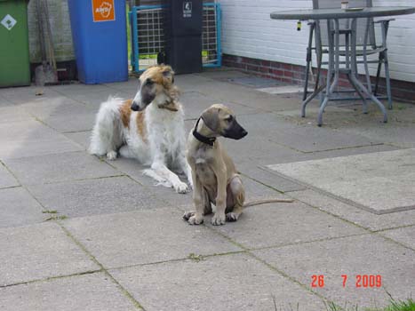 Am Samstag war es auch für den Sloughi Arnaud soweit. Der neue "Papa" kam über 800 km angereist, um den kleinen Buben abzuholen. Nach der langen Rückreise mußte der Süße sich erst mal ganz fest ausschlafen, um dann mit seinem eigentlichen Tageswerk zu beginnen, die Bude auf den Kopf zu stellen :). Alle anderen Vierbeiner haben ihn freundlich begrüßt, die Barsoi-Hündin hat ihn sofort adoptiert und wacht nun über unseren Kleinen.