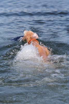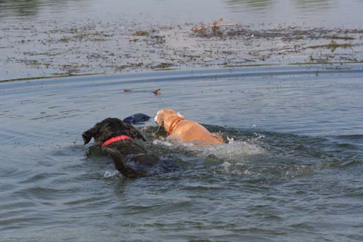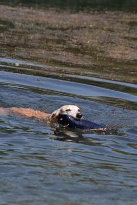 Dieser See war spitze und ich hab’ allen gezeigt, wie man so einen Dummy mit 500g ordentlich aus dem Wasser apportiert. Hier seht ihr mich auf dem Weg zum (dunkelblauen) Dummy.
