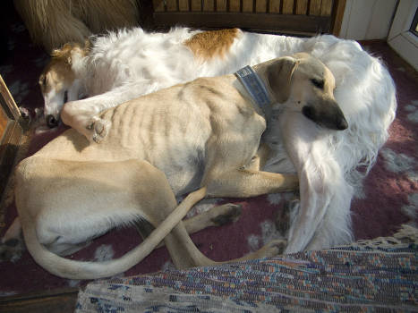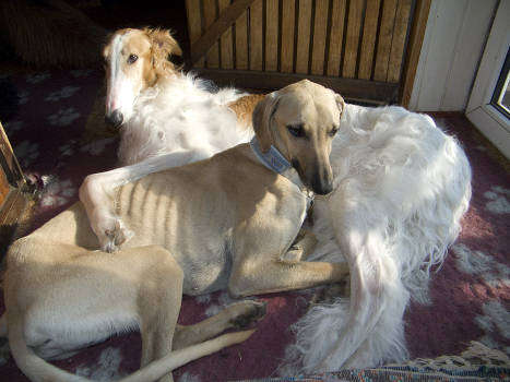 Auf unseren Pflegestellen entwickeln sich hin und wieder die interessantesten Freundschaften: Habib findet jedenfalls, daß die Steigerung einer Daunendecke ein Barsoibauch ist.... (dieser gehört Charly;-)