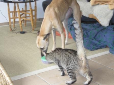 Nützlich macht sie sich auch schon: Da die andern doch recht schlampert ihre Näpfe leer fressen, sieht sie das jetzt als ihre Aufgabe, alle nachträglich gründlich zu reinigen. Notfalls auch dreimal bis auch das allerletzte Fitzelchen beseitigt ist. Sie ist da sehr penibel. Auch Joghurt und Sahnebecher spült sie gerne vor.