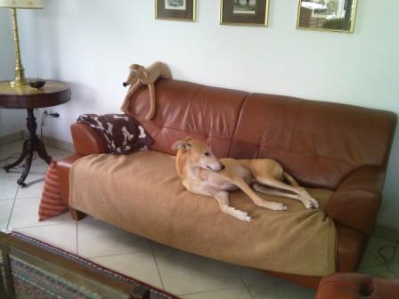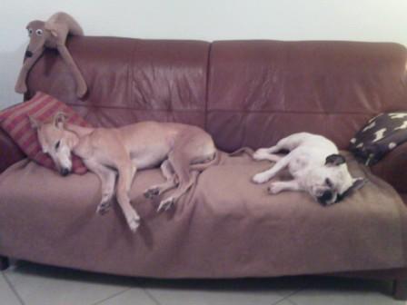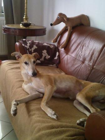 "Hier schneit es wie verrückt, ich habe eine saftige Mittelohrentzündung und eine Handvoll sandfarbenen Hund, der sich in rasanter Geschwindigkeit zum Superschmuser, Ohne-Leine-Flitzer, Tennisballfänger, Langschläfer entwickelt hat. Ein paar Mal habe ich schon gedacht, dass Alli ihn mir geschickt hat. Mancher von Shilos Habitus erinnert mich schon sehr an den jungen Alli. Er klaut wie ein Rabe, lacht und hat Spaß wenn er mal wieder die Bulldogge geärgert hat und rennt solange mit der Galga über die Felder bis eine/r von beiden den/die andere/n in den Poppes gezwickt hat. Er kommt immer von selbst zurück und wartet auch auf uns. Ein toller Schatz!!!! Gut er hat auch schon 2x auf den Wohnzimmerperser gesch...... und jault wenn ich nicht da bin, aber das lernt der kleine Mann auch noch!
