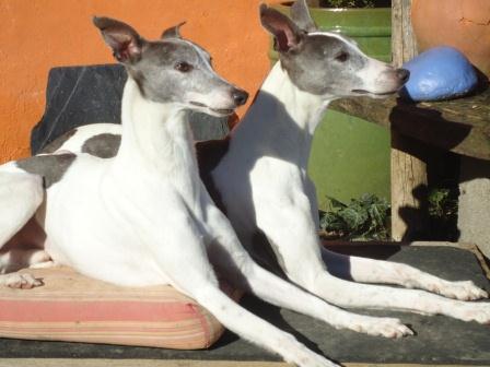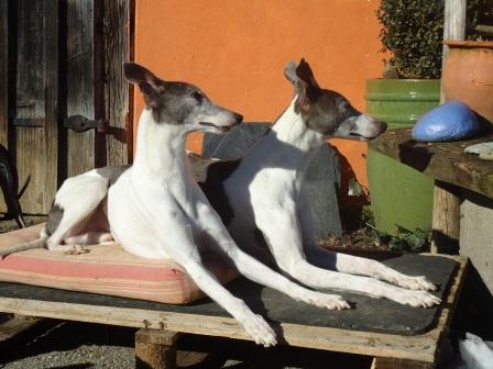 Heute Morgen wurden Pajti und Abel (links) zum letzten Mal besucht. Ihre neuen Menschen brachten zwei "Schweizer Halsbänder" für die beiden mit, rot mit weißem Kreuz. Sehr chic! Gino, der vorh. Whippie, hat dasselbe. Wir begossen den Umzug noch mit einem Glas Sekt und "Schümli", dann wurden alle drei ins Auto geladen und los gings. Wir sind gespannt auf die ersten Fotos.