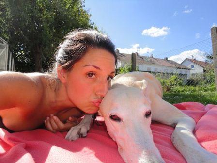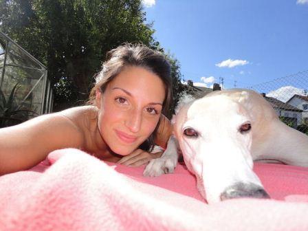 Greyhound Kashi, wie er liebevoll gerufen wird, ist jetzt neun Jahre alt und darf, außer bei Tochter Jenni auf dem Teppich, nachts im "Gräbele" seiner Besitzer schlafen.