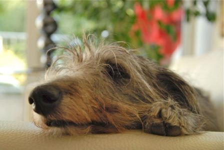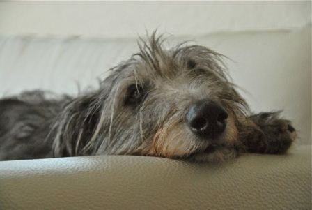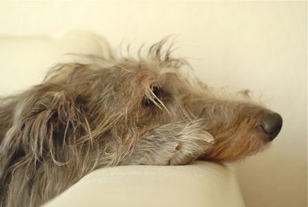 Roy räumte seinen Sofaplatz und mußte seine Nase auf dem Boden parken, weil das Ausweichkissen zu klein war.