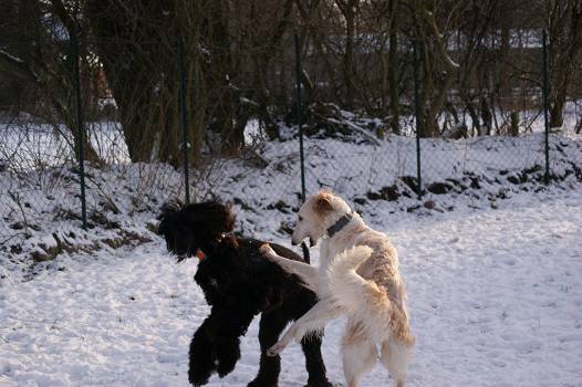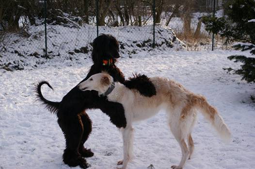 Und wie man sieht, kann eine Afghanen-Hündin jede Menge Spaß mit einer Barsoi-Hündin haben. Wanda ist aber auch mit anderen Hunderassen groß geworden und ist nicht sonderlich rassistisch...