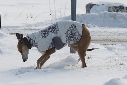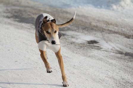 Winterbilder von Lester, der glücklich mit seinem neuen Mäntelchen durch den Schnee flitzt.