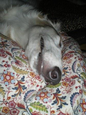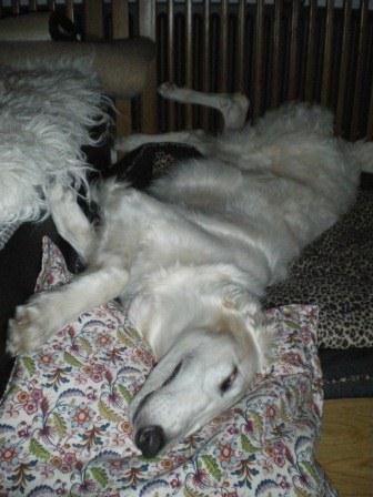 Gut, dass ich eine ebenerdige, riesige Dusche habe. Heute hat sie mit mehreren Hunden gespielt und sich zum Schluss im Matsch gewälzt. Der ehemals weiße Hund war braun und grün. Das Duschen mit lauwarmen Wasser findet sie toll! Nach der Dusche wurde ein Zahnreinigungsknochen bearbeitet und nun schläft das liebe Schäfchen tief und fest, sodass ich mich an den PC setzen kann.