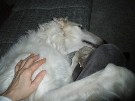 Das Einzige was nicht klappt, ist das Alleinbleiben für ein paar Minuten. Sobald ich auch nur für ein paar Minuten (Müll wegbringen) das Haus verlasse, weint sie herzergreifend. Einkaufen klappt nur, wenn ich einen Hundebabysitter habe. Einer meiner Söhne muss dann bei ihr bleiben. Trotzdem weint sie dann und ist erst ruhig, wenn ich wieder im Türrahmen stehe. Nun ja, wir arbeiten daran. Alles auf einmal ist auch zuviel verlangt. :-))))