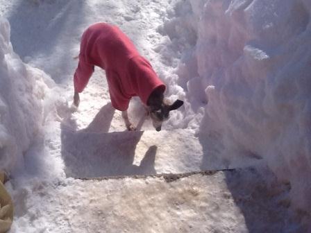 Es ist kalt und wir haben zwei "Snuggles" bestellt, supertolle Fleeceanzüge mit Beinchen. Auch wenn Lilli mal "neben der Spur" läuft, also etwas im Tiefschnee landet, ist das kein Drama, Fleece ist ruckzuck wieder trocken.