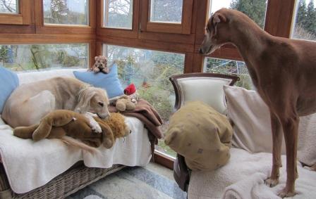 Wohngemeinschaft. Tenner mochte ihn ebenfalls auf Anhieb, was die Bilder von heute morgen auch wieder zeigen. Die beiden teilen sich Garten, Sofas und unser Bett sehr einträchtig. Zu Arielle ist Monty sanft und distanziert.
