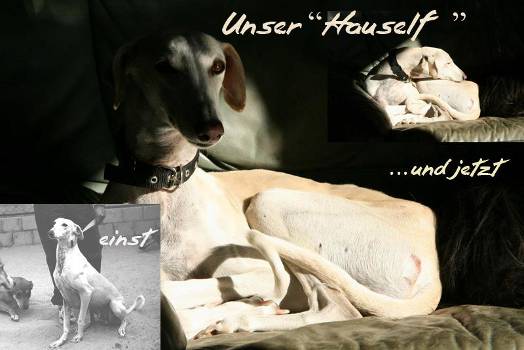 "Vor nun fast 10 Monaten erhielten wir den Anruf, möchtet Ihr drei Salukis aus einem Shelter aus Kuwait bei Euch aufnehmen??? Einen Moment war es dann still am Telefon…. Urgs…. Gleich drei dachten wir! Zugleich schossen uns viele Bilder durch den Kopf, Hunde die fast wild sind, keine Erziehung genießen durften, vielleicht nicht nett zu unseren Hunden sind, vielleicht auf dem Tisch stehen um einen besseren Überblick zu haben, total ausgehungert alles zu klauen was nicht mit einem großem Vorhängeschloss gesichert ist, die Nächte im Garten zu verbringen, weil sich die drei entschlossen haben im Freien zu übernachten, vielleicht noch mehr Putzeimer kaufen zu müssen um in jedem Zimmer einen samt Wischmopp zu postieren, einen Werbevertrag mit einer Reinigungsmittel Firma abzuschließen, zerstörte Sofas, zerrissene Sessel…! Und gleichzeitig höre ich mich am Telefon sagen, JA, natürlich tun wir das! Wir freuen uns auf die drei „ Sandmännchen“ alle drei sandfarben und nur Sand gewohnt. Sicher eine Herausforderung für Mensch und Hund aber wir wollten es angehen!