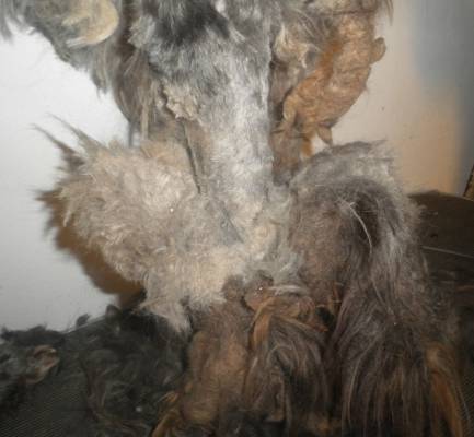 Petra hat spätestens jetzt die Meisterprüfung als Hundefriseur bestanden. Denn Filz, der ganz dicht an der Haut sitzt ohne Verletzungen zu entfernen ist eine Königsdisziplin beim Scheren. Zudem das Fell teilweise bereits eine betonähnliche Konsistenz erreicht hatte, daß wir uns zeitweise überlegt haben, ob wir nicht ein Teppichschneidemesser zur Hilfe nehmen müssen.