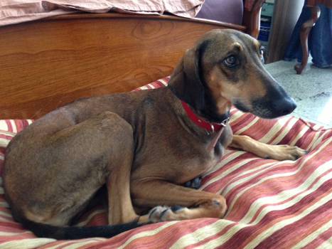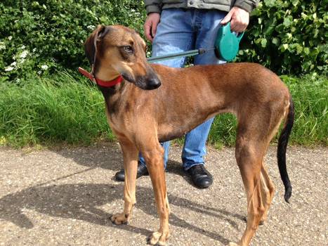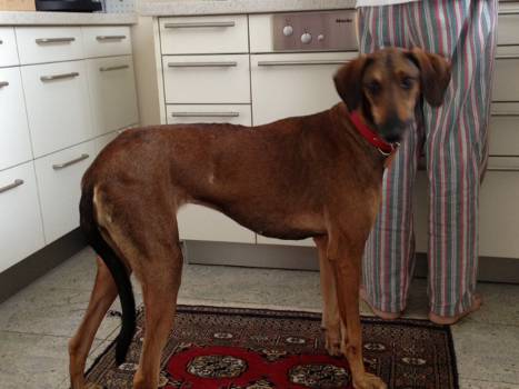 Athina stammt aus Rhodos und sieht auf der ersten Blick wie ein Kurzhaar-Saluki aus. Nun haben wir uns schlau gemacht, und mußten feststellen, daß es auf Rhodos eine eigene Windhundrasse gibt: der Lagonikos Tis Rhodou.