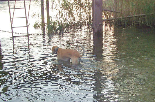 Sein Frauchen Heid schreibt: "Anbei ein paar Bilder von unserem Kiwischatz. Wir waren gerade ein paar Tage am Bodensee und Kiwi, sonst immer wasserscheu, ist diesmal schön geschwommen und war total übermütig. Er ist ein richtiger Schmusehund geworden und erobert sich nun auch zeitweise unser Bett, wenn Tascha es zuläßt. Bei den momentanen Temperaturen ist es aber nicht so ganz angenehm mit zwei Hunden das Bett zu teilen. Er macht uns viel Freude und wir sind froh, dass wir ihn haben. Er hat schon viel gelernt, nur das Stehlen kann er nicht lassen. Da hat er uns erzogen. Möglichst nichts essbares unbeaufsichtigt lassen und die Küche wird immer von ihm kontrolliert, ob nicht doch was zu finden ist. Es ist schon lustig mit ihm."