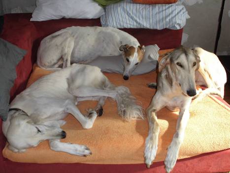 Einträchtig liegen die drei Jungs zusammen: unser Saluki Kasimir, Greyhound D'Artagnan und der CP Gobi.