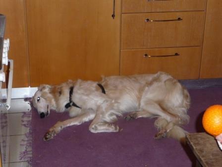 Miro war nicht ängstlich anderen Hunden gegenüber, vor Menschen hatte er Angst, er war handscheu und lies sich erst Wochen später von seiner Pflegemama richtig kuscheln, er lernte es zu geniessen, warf sich zum Schlafen am Liebsten auf den Rücken und blieb zuletzt auch so liegen, wenn ein bekannter Mensch an ihm vorbei ging. Dann kam ein junger Pflege-Afghanenrüde in sein Rudel und Miro spielte wie verrückt, schon morgens um halb sieben ging die wilde Hatz durch den Garten los, herrlich.