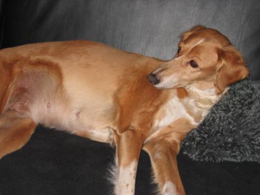 Als "Lohn" erhielten wir auch Bilder von unserer mittlerweile fast 10 Jahre alten Shirin (ehemals Rita, vermittelt 2008). Wir wissen immer noch nicht genau, ob die Maus eine reinrassige Saluki-Hündin ist, aber eigentlich auch egal. Jedenfalls ist Frauchen glücklich mit ihr und sie sieht ebenfalls so aus, auch wenn sie als kastriertes Mädchen eben immer Hunger hat und Frauchen ein gutes Herz :)