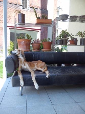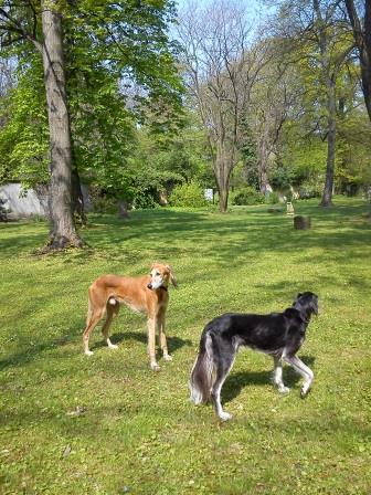 "Liebe Ellen, beide Hunde haben Stress und haben heute beide Durchfall und gekotzt. Aber immerhin beide. Wobei man Beaker nix anmerkt, er wirkt so souverän und gelassen und ist lieb ohne Ende, selbst wenn Jatagan kläfft. Aber wir sind zuversichtlich... Beaker hat sich in unseren Nachbar Wippet verguckt und spielt wie verrückt, jagt Tauben und heute auch Katzen. Ich kann gar nicht alles schreiben... herrliche lange Spaziergänge, beide Hunde friedlich und leinenlos. Beaker ist so zauberhaft und begeistert alle bis auf die, die mich verklagen wollen, weil ich den Hund verhungern lasse. So geschehen gestern vor der Oper... Also erst mal soviel. Und zum Thema alter Hund, das ist wohl wie mit einem guten alten JahrgangsWein. Den kriegt ihr jedenfalls nicht wieder, der Süße bleibt bei uns. Hänge noch ein paar Bilder dran . GRUß Helga"