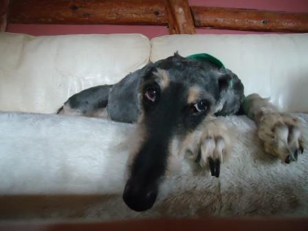 Doch wir hatten die Rechnung ohne Harrison gemacht, der nicht bereit war, ins Auto einzusteigen und sein Zuhause zurückzulassen. Das hieß, daß unsere "kampferprobte" Monika den ganzen Weg fahren mußte, um dem Buben einzupacken. Mittlerweile war es spät geworden und Harrison blieb über Nacht bei Monika, die ihn dann auch Morgens erst mal nackig machte (Harrison ist 12 Jahre alt und kennt das Kämmen nicht aus seinem Vorleben). Montagmittag holte ihn dann seine Pflegemama und wie man sehen kann sitzt er ganz zufrieden dort auf dem Sofa.