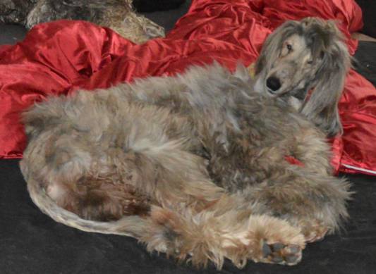 Sein Fell am Bauch und zwischen den Beinen ist "lila" dank der vorherigen Verwahrlosung.