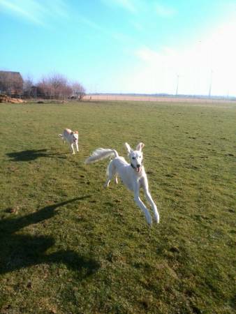 Dieses Wochenende war es dann soweit, Yashar ist umgezogen und wir haben schon ein Bild bekommen, wie er fröhlich mit seiner neuen griechischen Freundin über die Wiese hüpft. Herrchen rief auch ganz glücklich an, daß er sich nach zwei monatiger Saluki-Abstinenz nun wieder wie ein vollständiger Mensch fühlen würde.